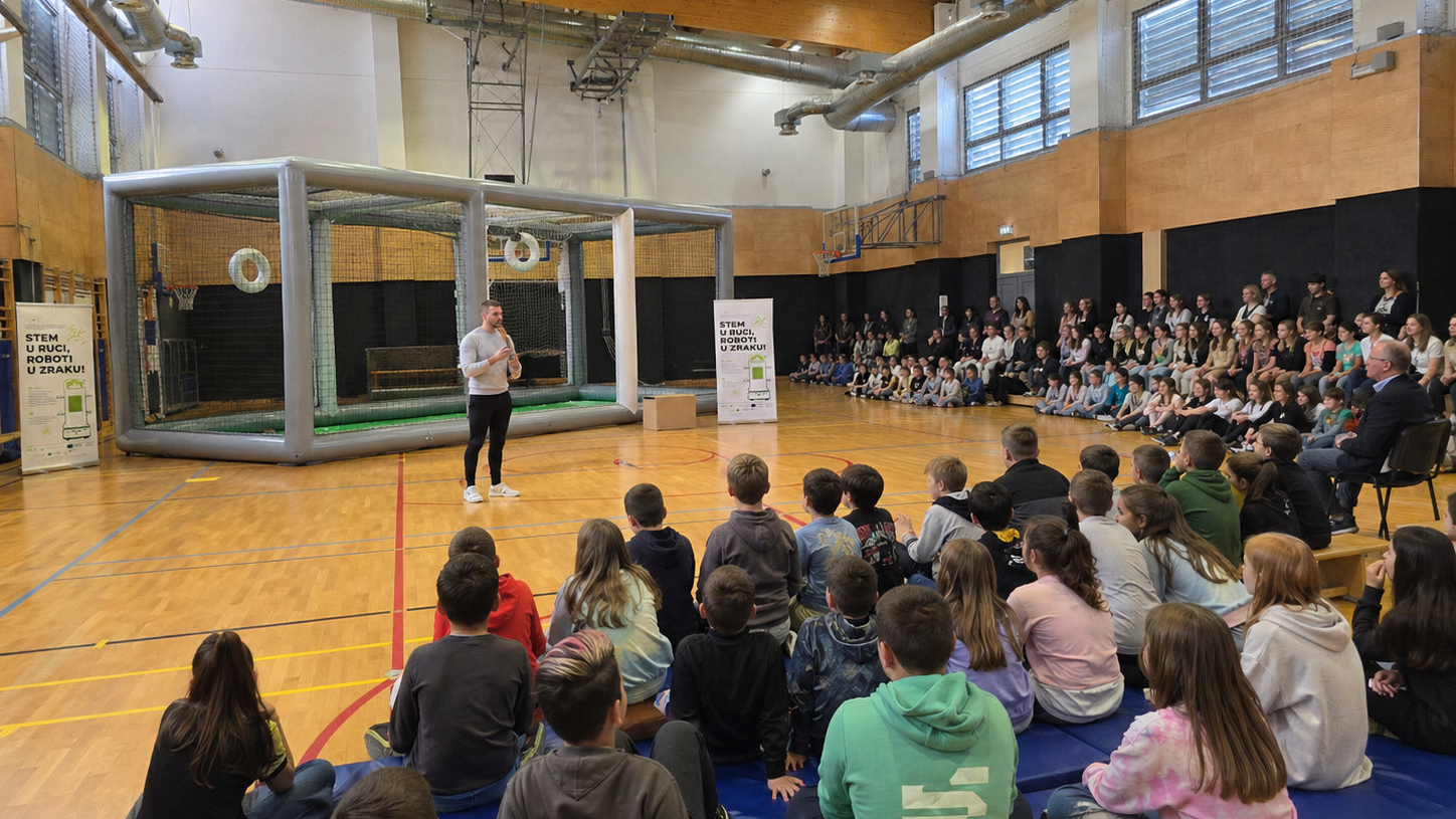 Poseban interes izazvala je velika dron arena, koja je učenicima omogućila da promatraju i upoznaju upravljanje dronovima u kontroliranom i sigurnom prostoru. Upravo je dron arena bila jedan od vizualno najatraktivnijih elemenata programa te je dodatno pridonijela tome da STEM sadržaji budu djeci razumljivi, dinamični i motivirajući. Kroz ovakav format učenici su mogli jasnije razumjeti pravila sigurnog rukovanja dronovima, ulogu zaštitnog prostora pri letenju te način na koji se tehnologija može koristiti kao alat za učenje, suradnju i razvoj novih vještina.