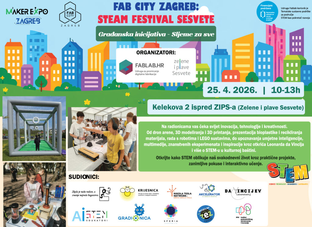 Akcelerator za održivo društvo (ACC) sudjelovat će na događanju Fab City Zagreb: STEAM Festival Sesvete, koje će se održati 25. travnja 2026. godine od 10 do 13 sati na lokaciji Kelekova 2, ispred ZIPS-a (Zelene i plave Sesvete).